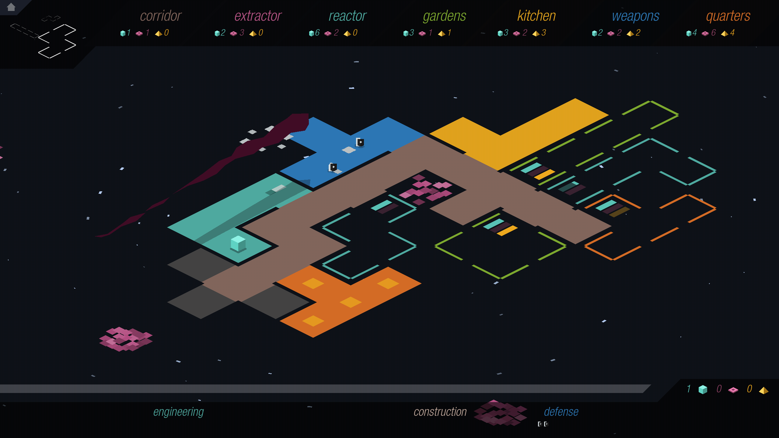 Your goal is to manage a Tron-like space station by allocating resources defenending it from attack. You control minions, which are white rectangular prisms that go around doing various tasks, like building the defenses or transferring the sludge from the garden into the kitchen.