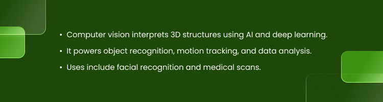 3D vision enhances computer vision by interpreting depth and spatial relationships. It simulates how humans perceive the world.